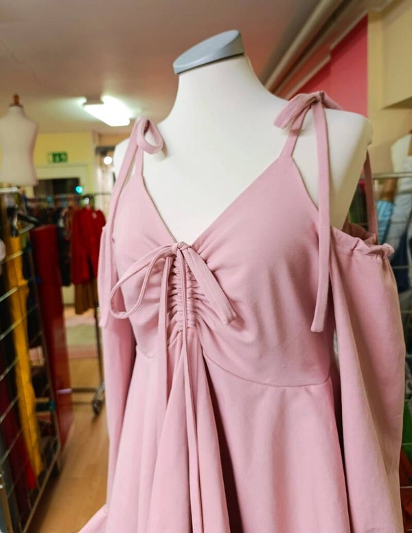Kauniisti laskeutuva keijumekko säädettävillä naruolkaimilla.Ilman hihoja 70€Materiaaliksi sopii mikä tahansa trikoo